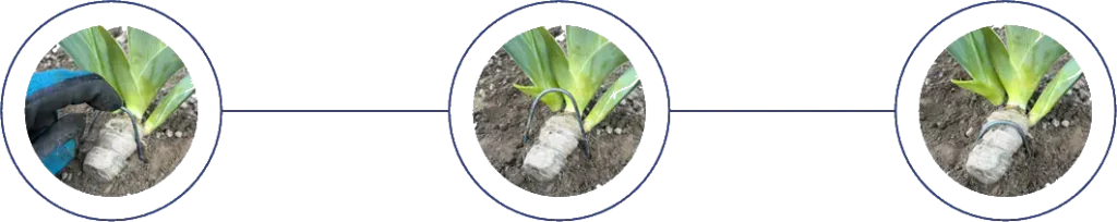 Los lirios deben plantarse de tal manera que el rizoma quede expuesto al aire y las raíces extendidas bajo tierra. Después de plantado es importante regar alrededor del rizoma para compactar el suelo. Para ayudar al rizoma a adaptarse, es recomendable plantarlo con la ayuda de un alambre en forma de U, presionando el rizoma de forma vertical como lo muestra la siguiente imagen.