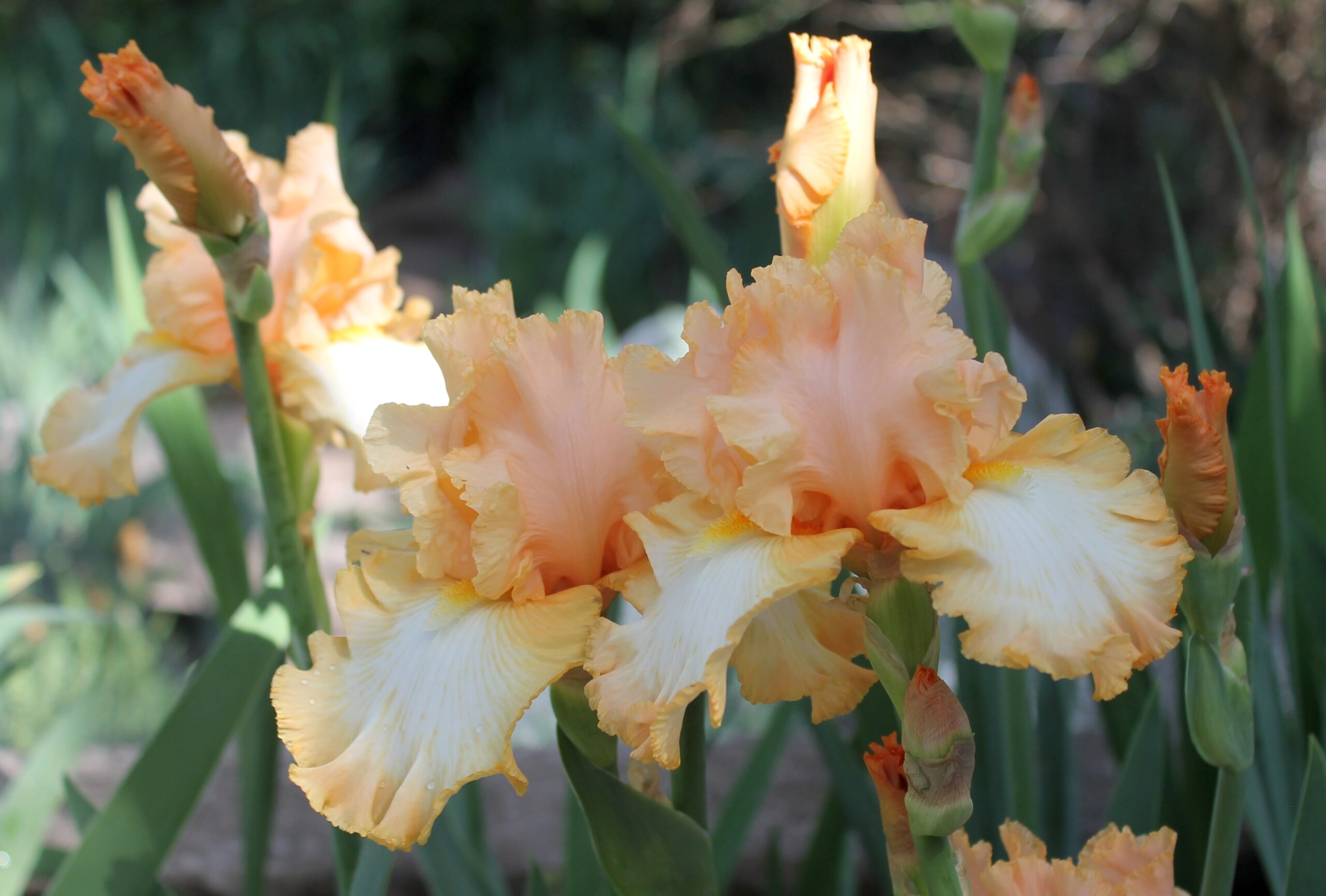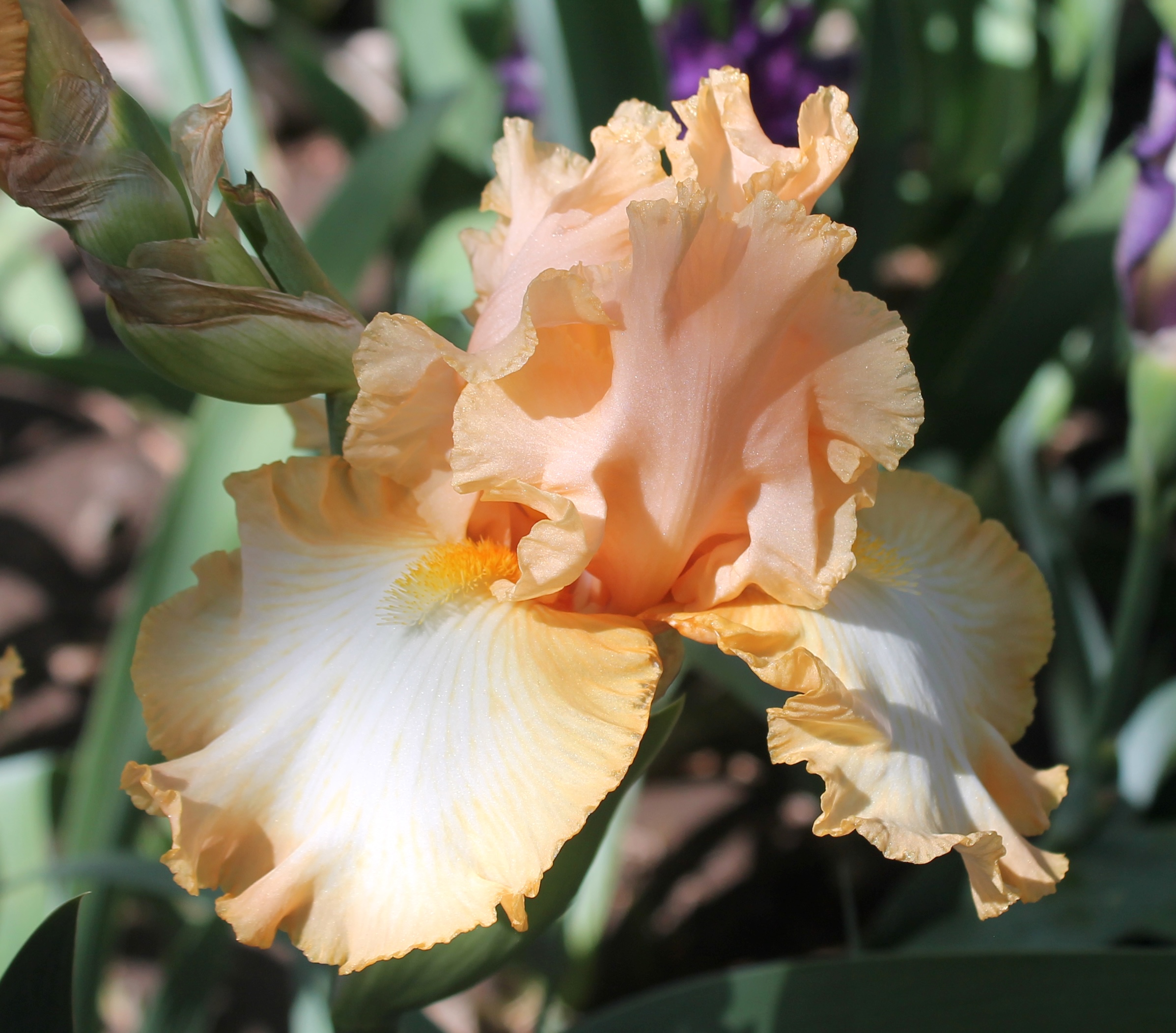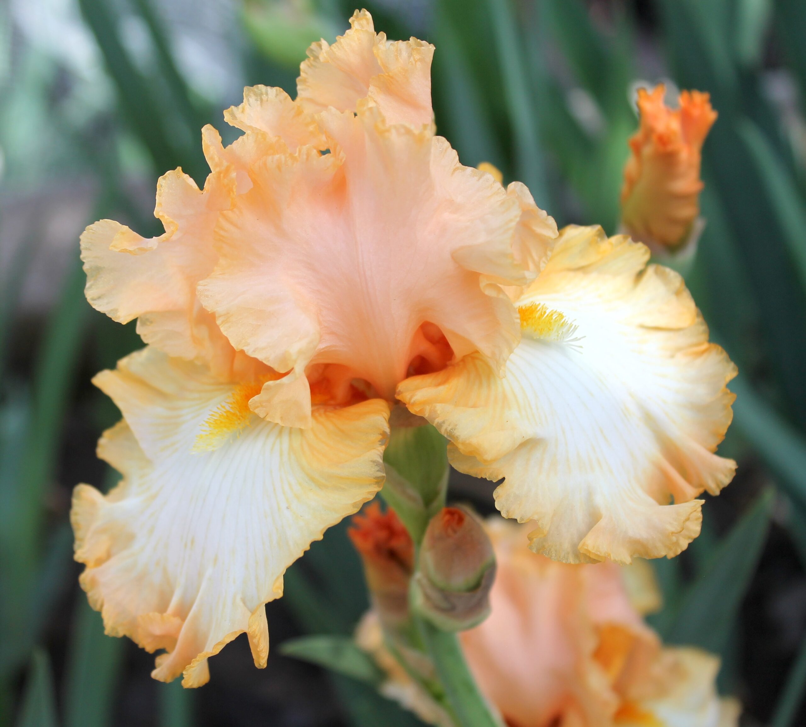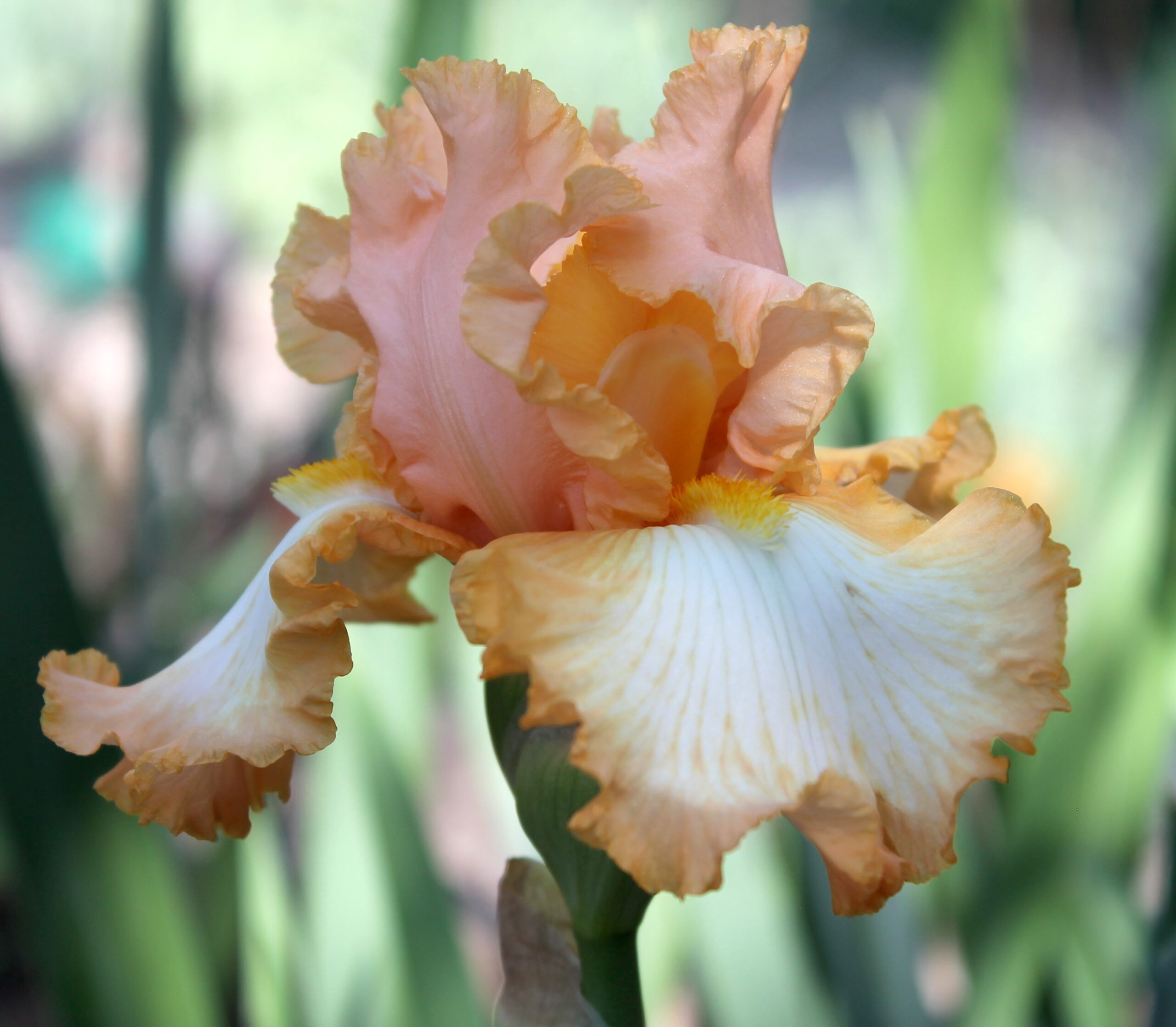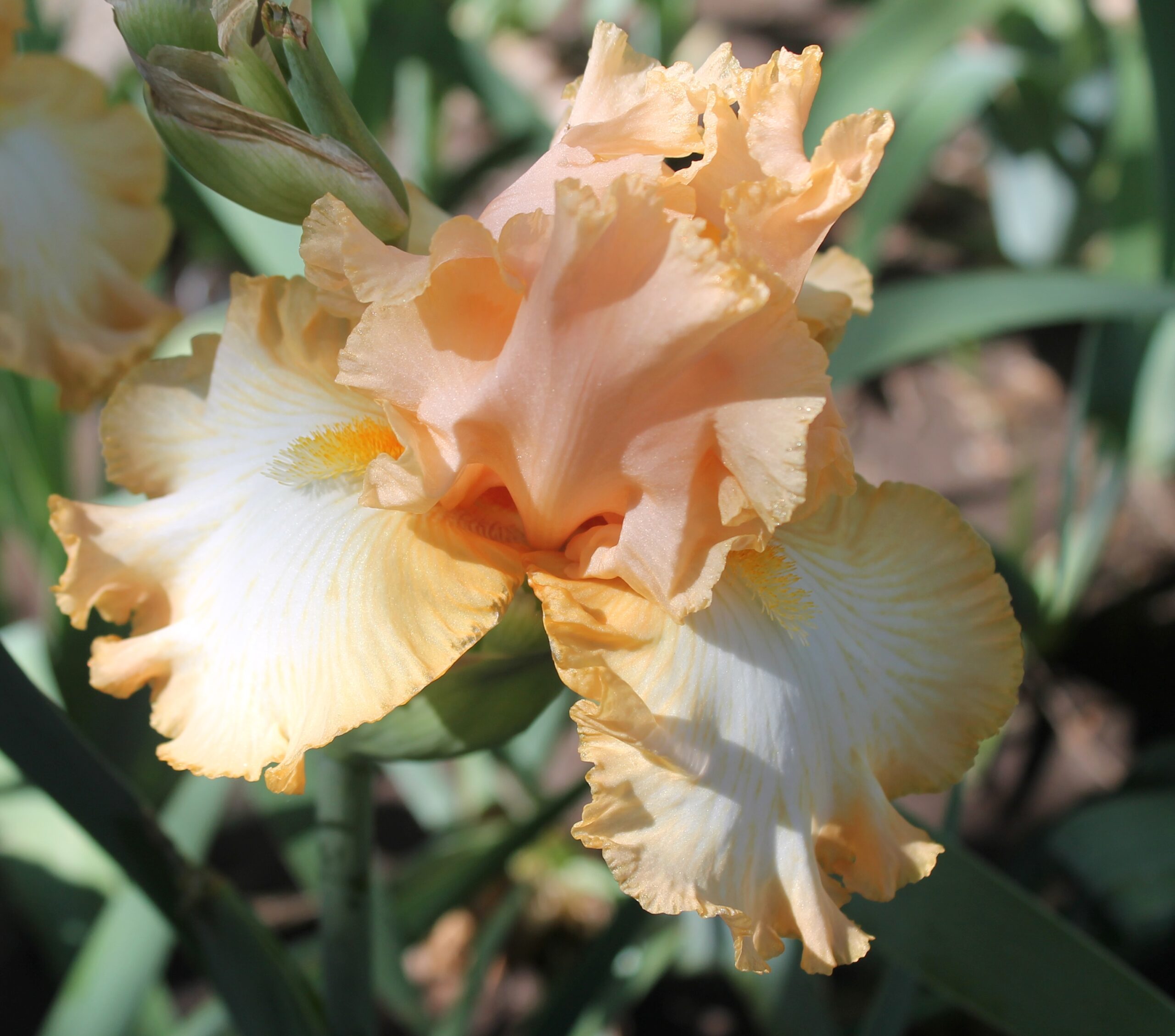 Iris alto barbudo con pétalos color salmón pálido y sépalos blancos con banda naranja de 1cm aprox., barbas amarillas y naranja en la garganta.