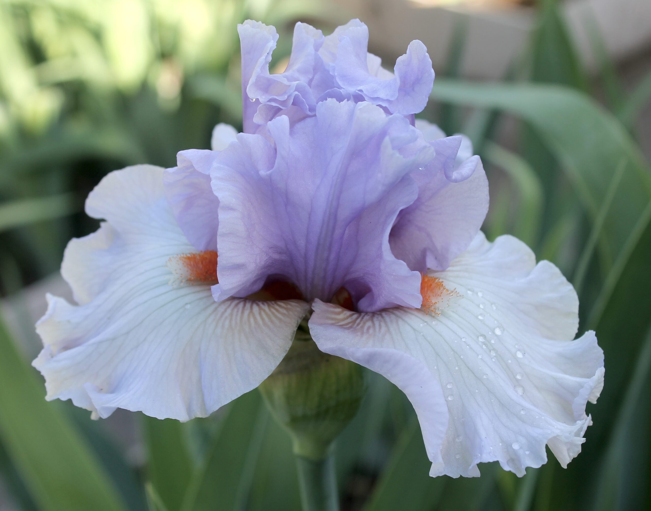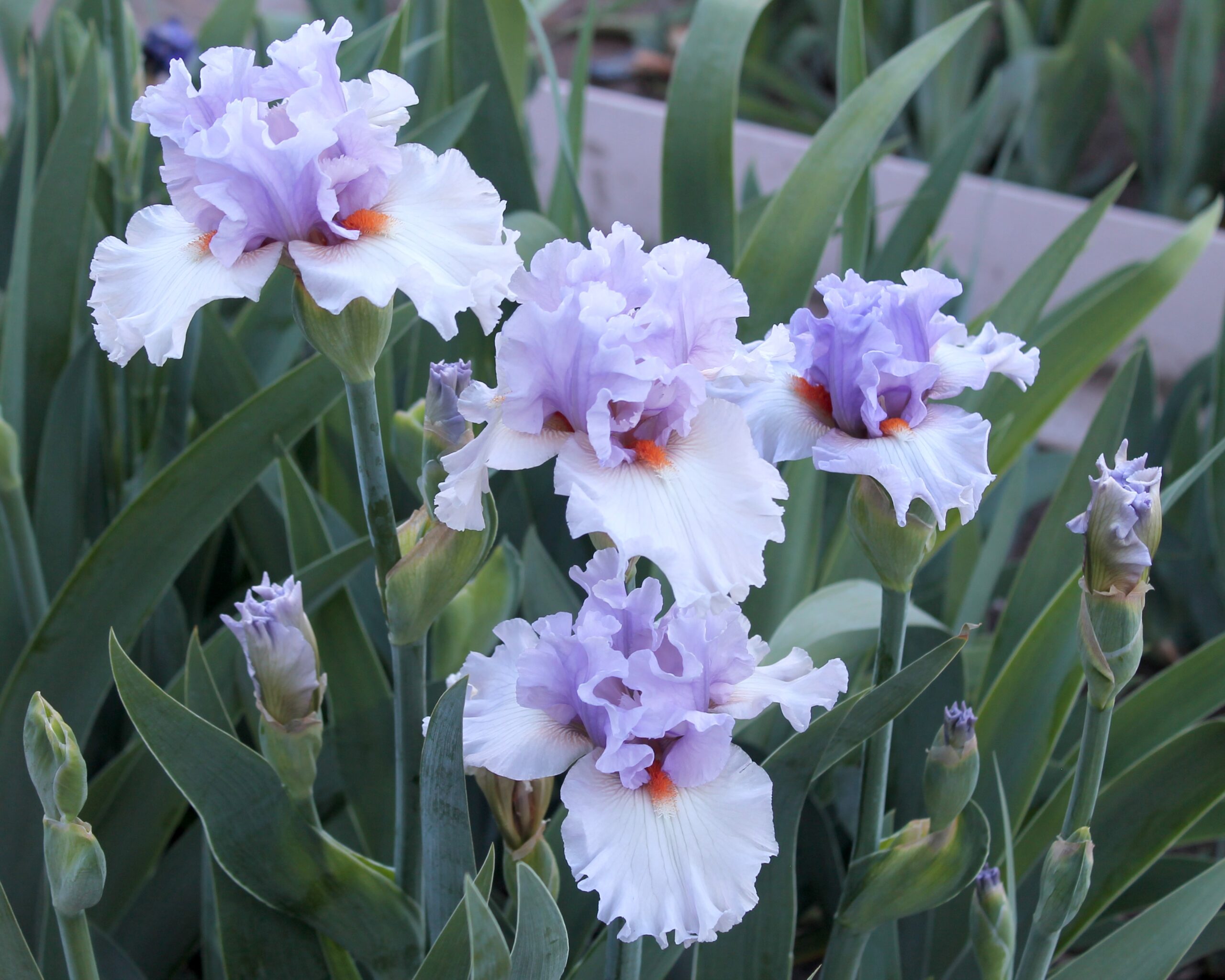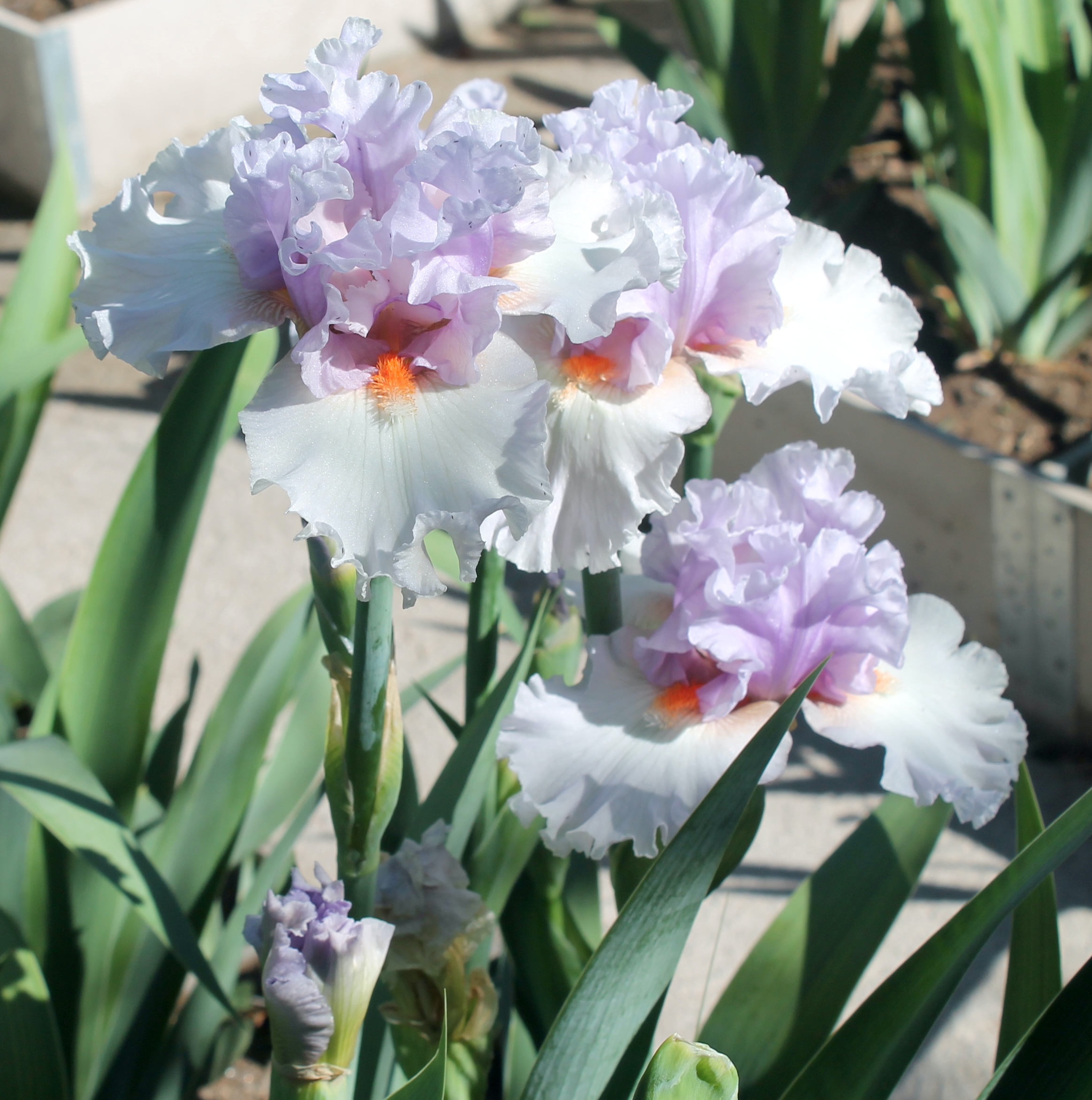 Iris alto barbudo bitono con pétalos color lavanda orquídea claro y sépalos color rosa beige claro con venas color rosa más oscuro en el mando y barbas color mandarina muy rizadas.