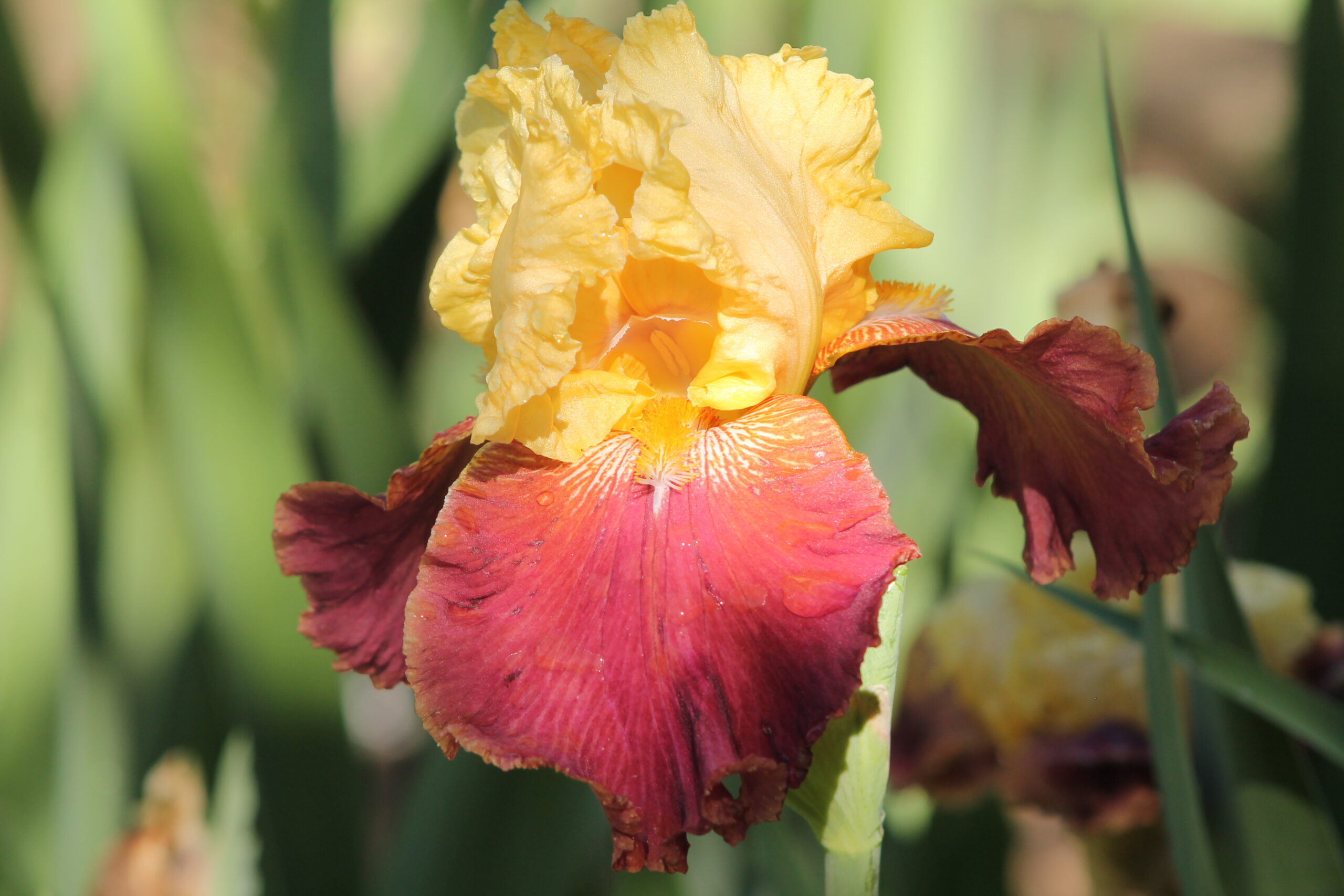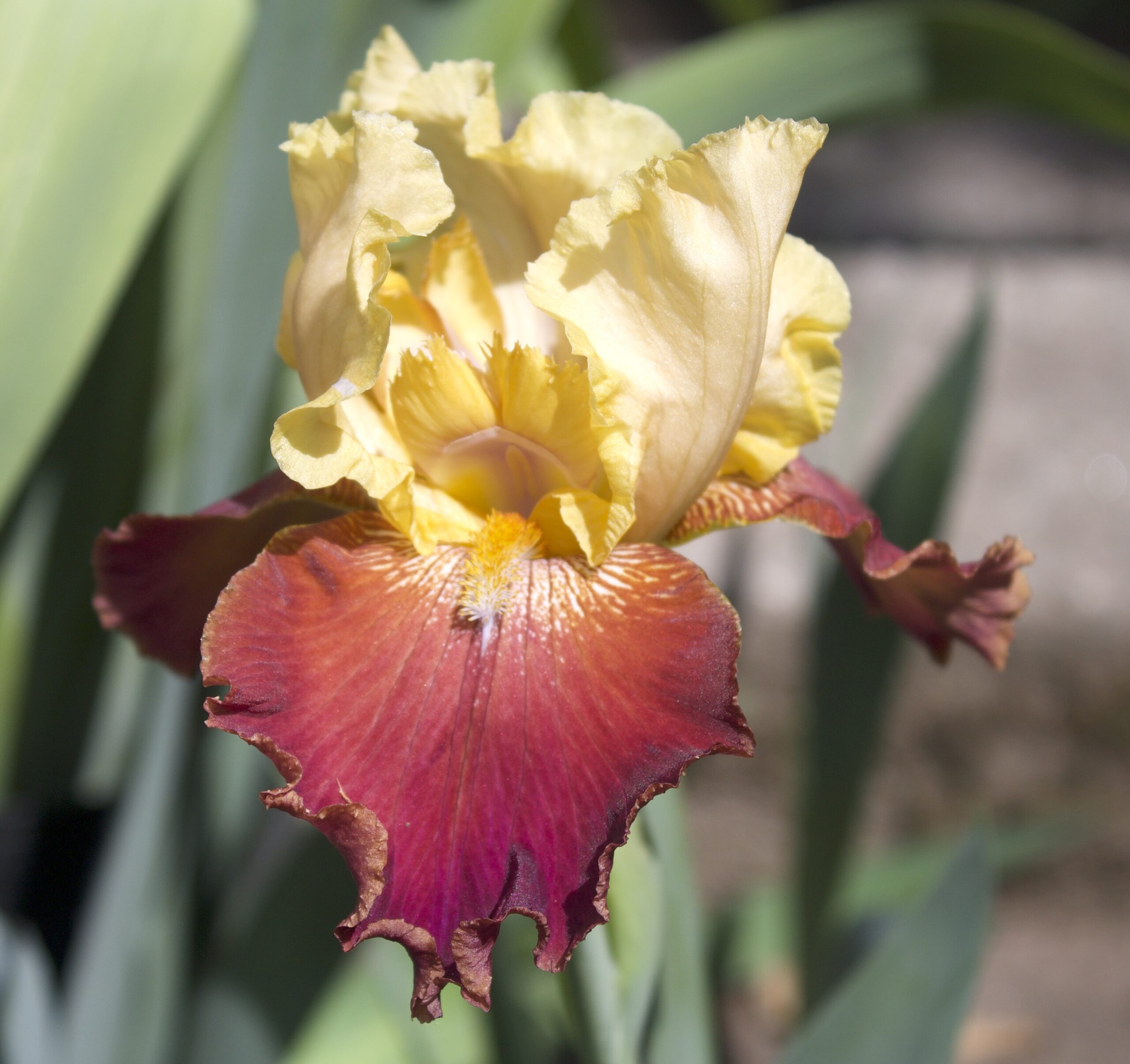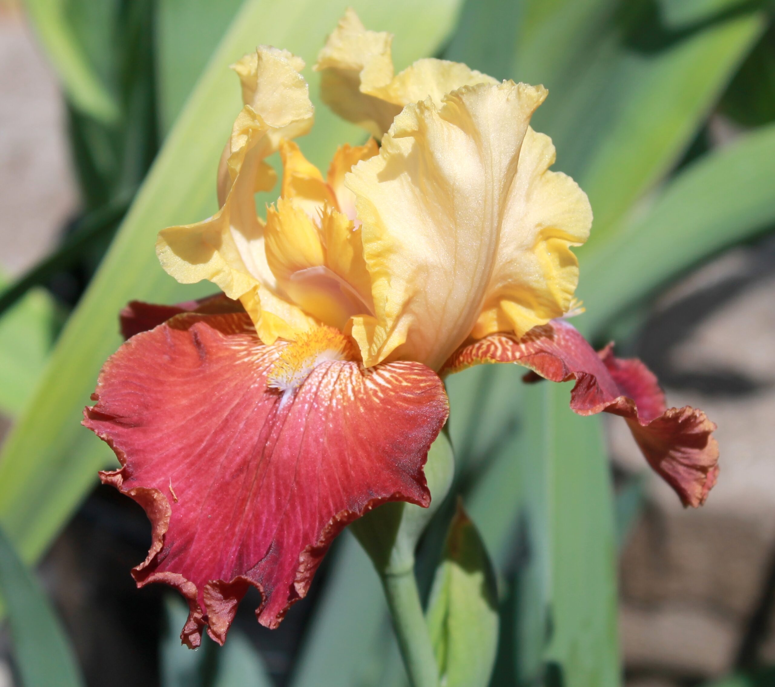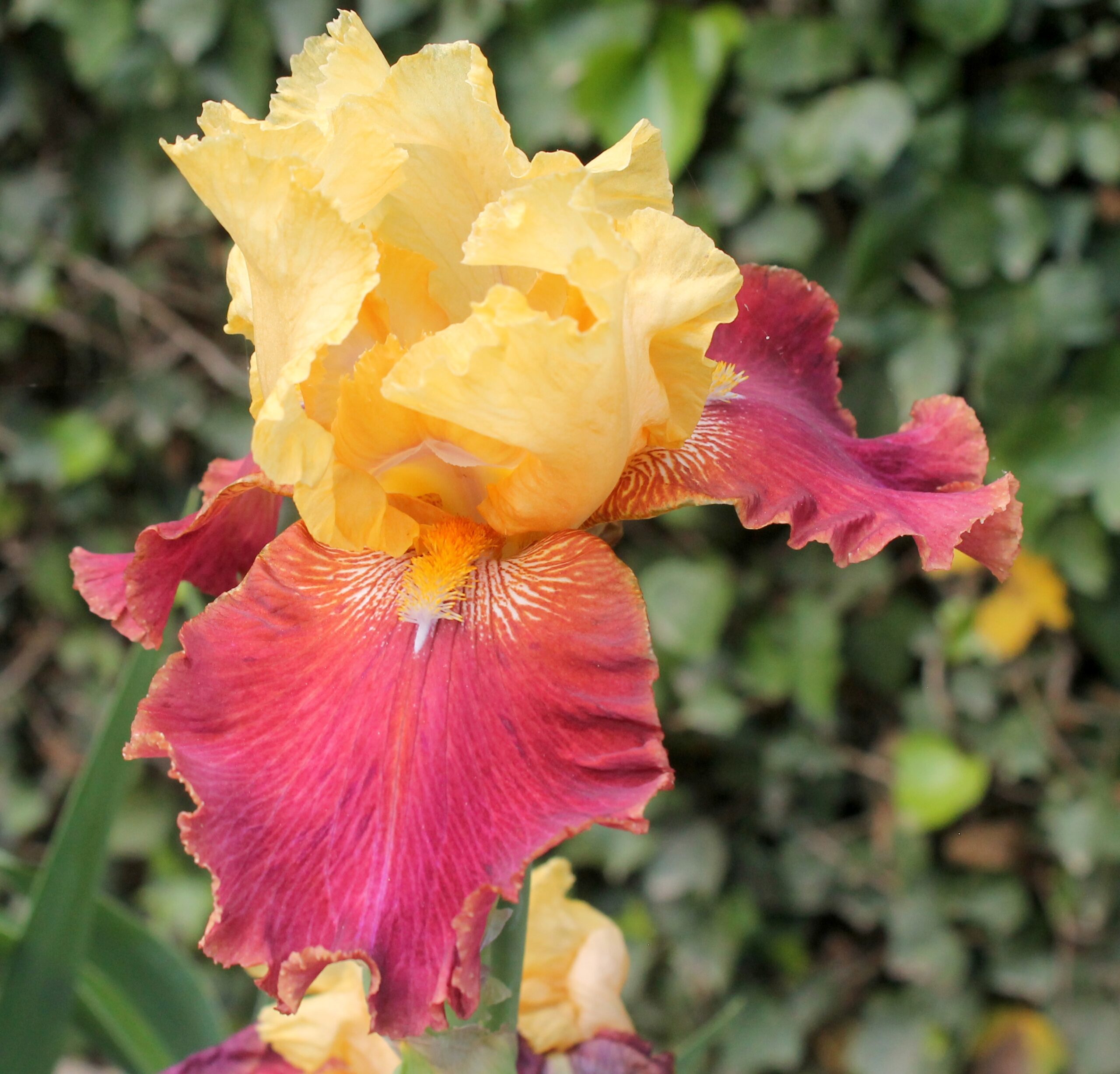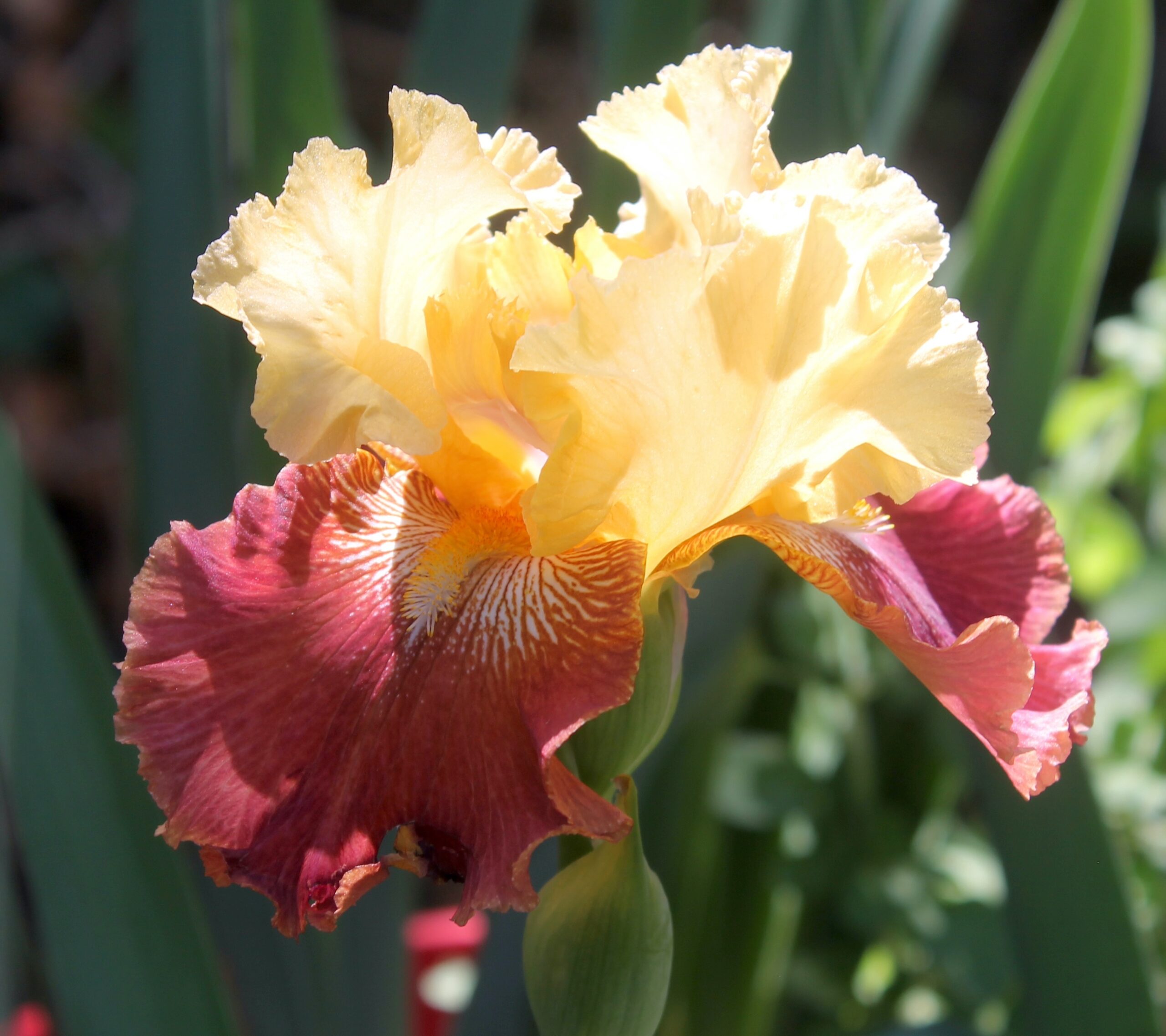Iris alto barbudo variegata con pétalos color amarillo manteca y sépalos de color rojo burdeos y notas blancas en la garganta con barbas de color naranja claro.
