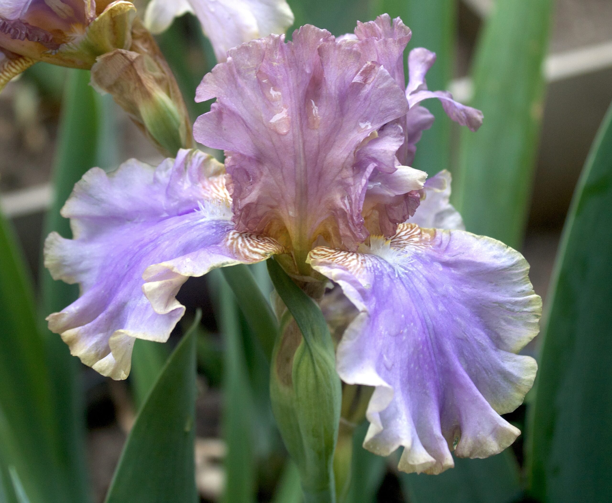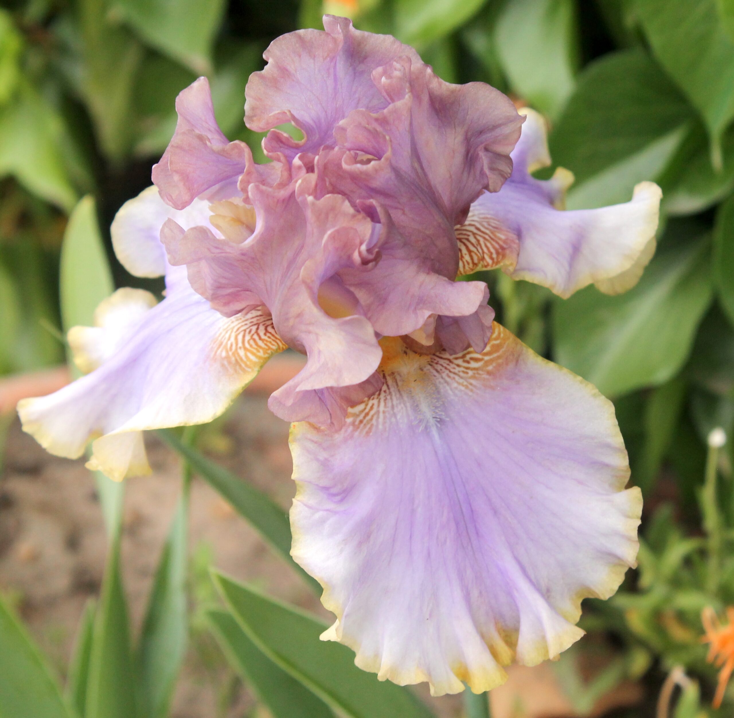 Iris alto barbudo con pétalos color amarillo ahumado caramelo con tintes violáceos y sépalos color azul lavanda claro con borde amarillo y barbas amarillas.