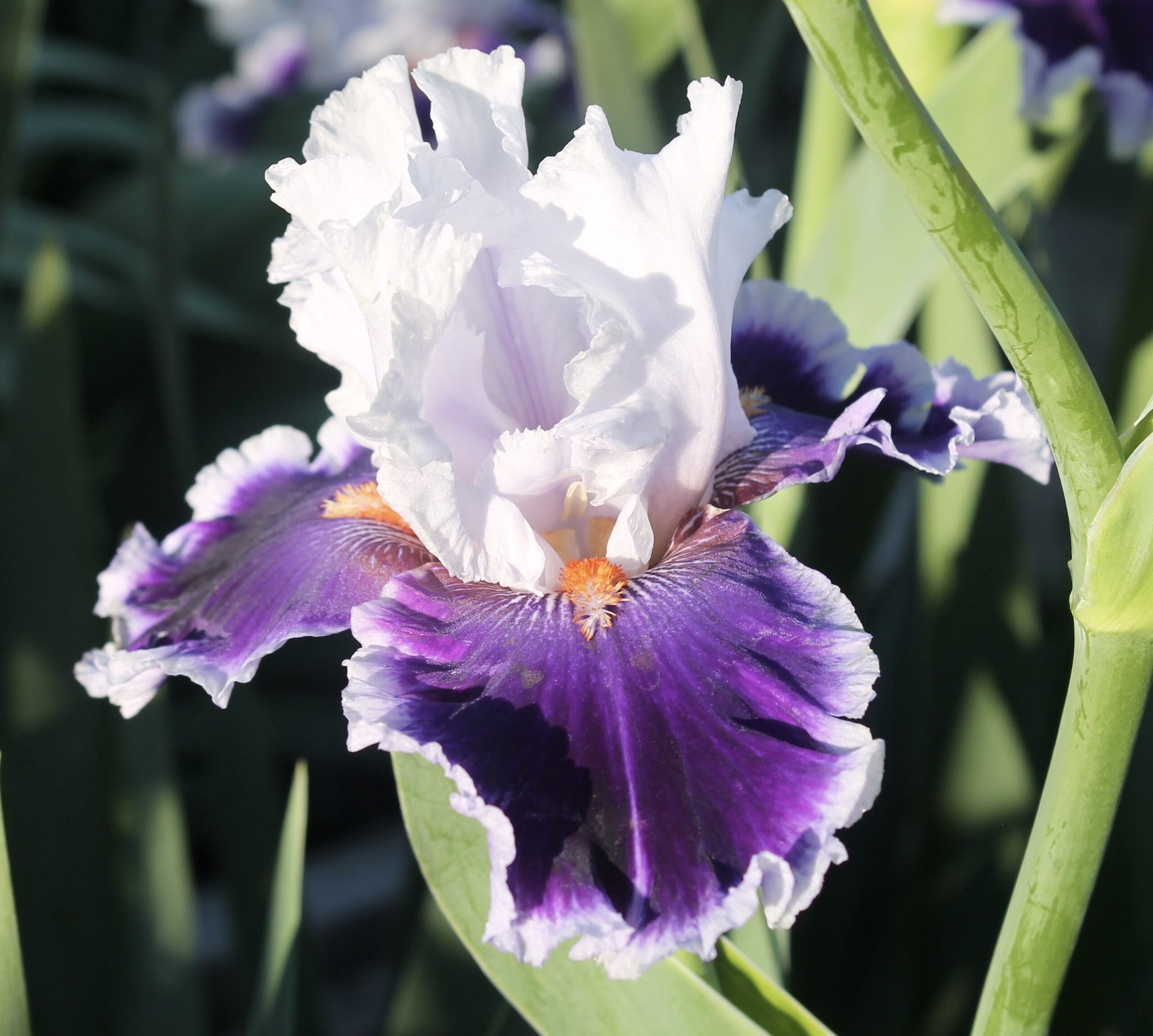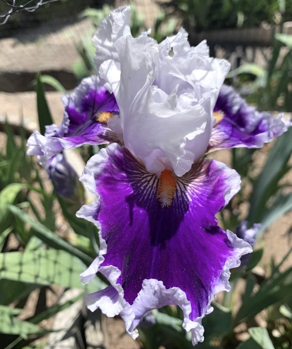 Iris alto barbudo con pétalos de color blanco azulado y sépalos de color azul morado aterciopelado con tonos negros y ancha banda azul blanca rizada con barbas de color mandarina.