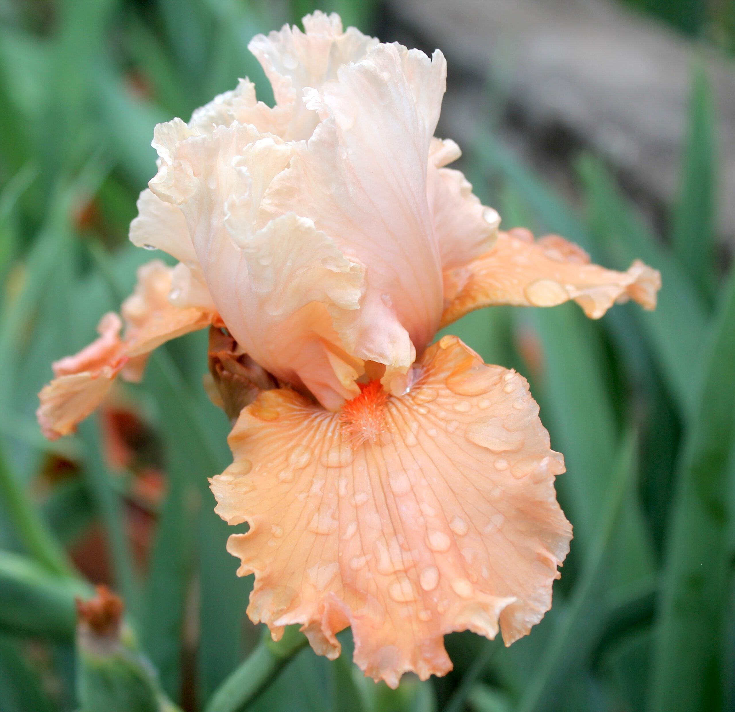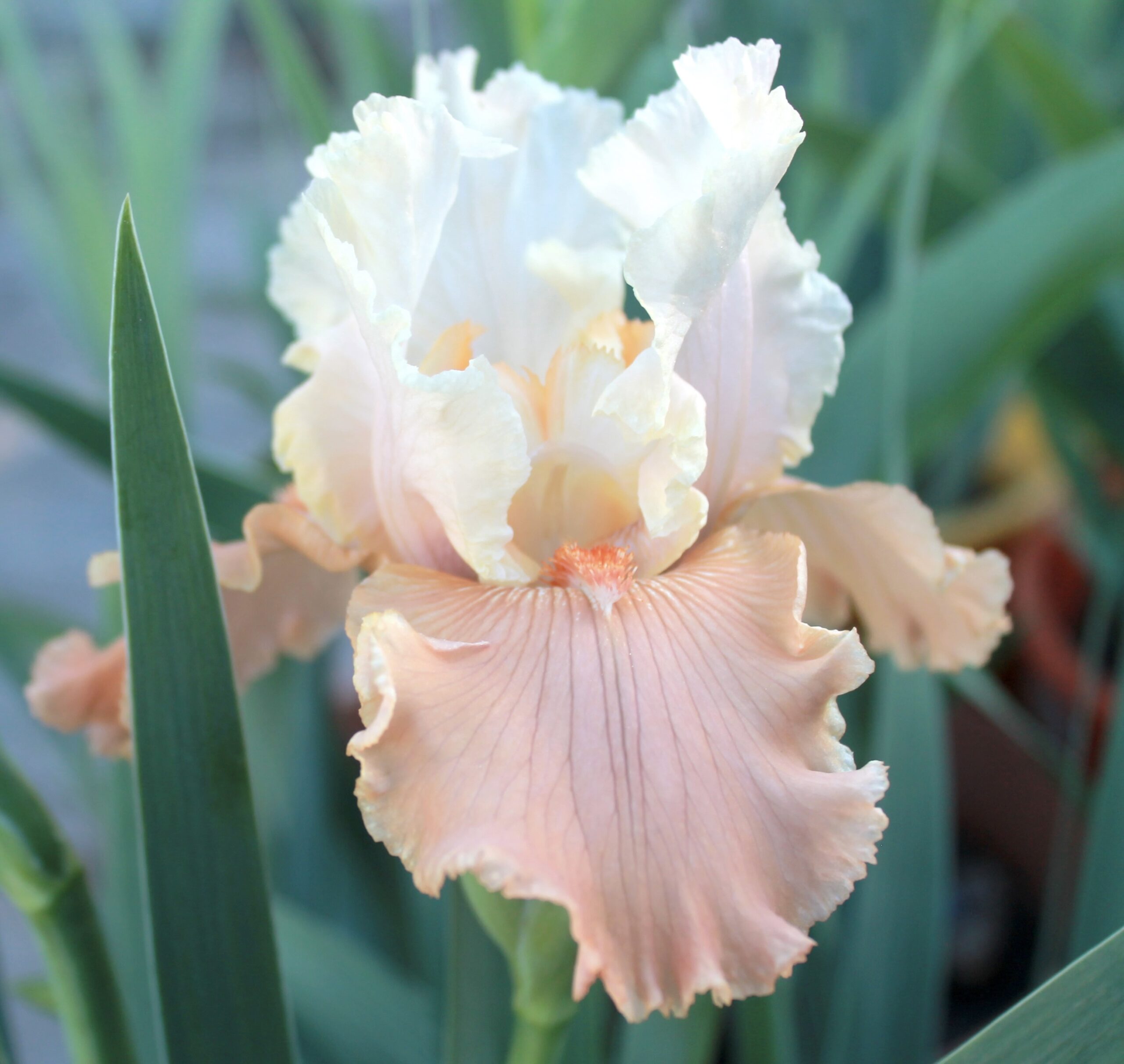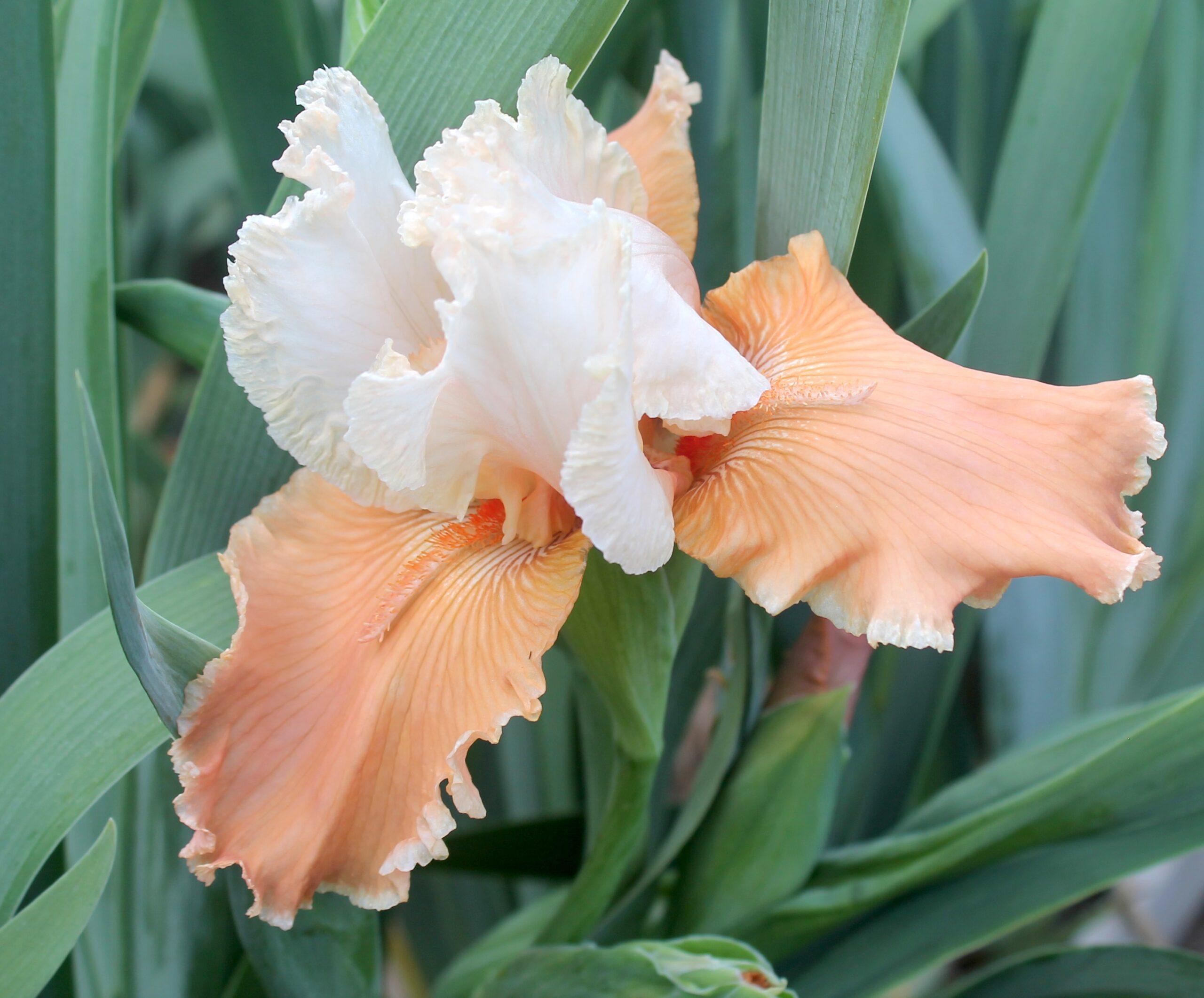 Iris alto barbudo de pétalos blancos puro y sépalos color damasco cobrizo con barbas color mandarina.