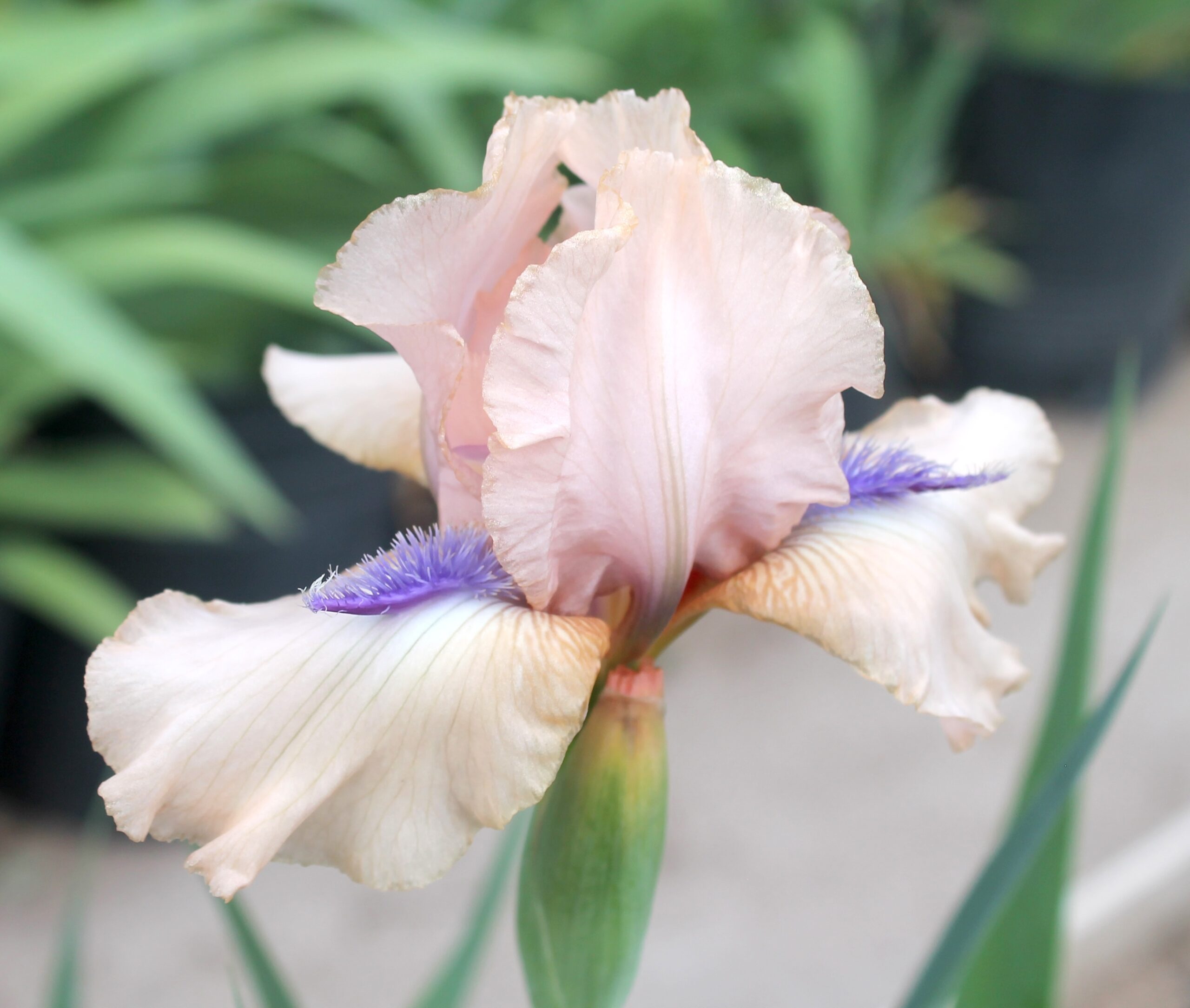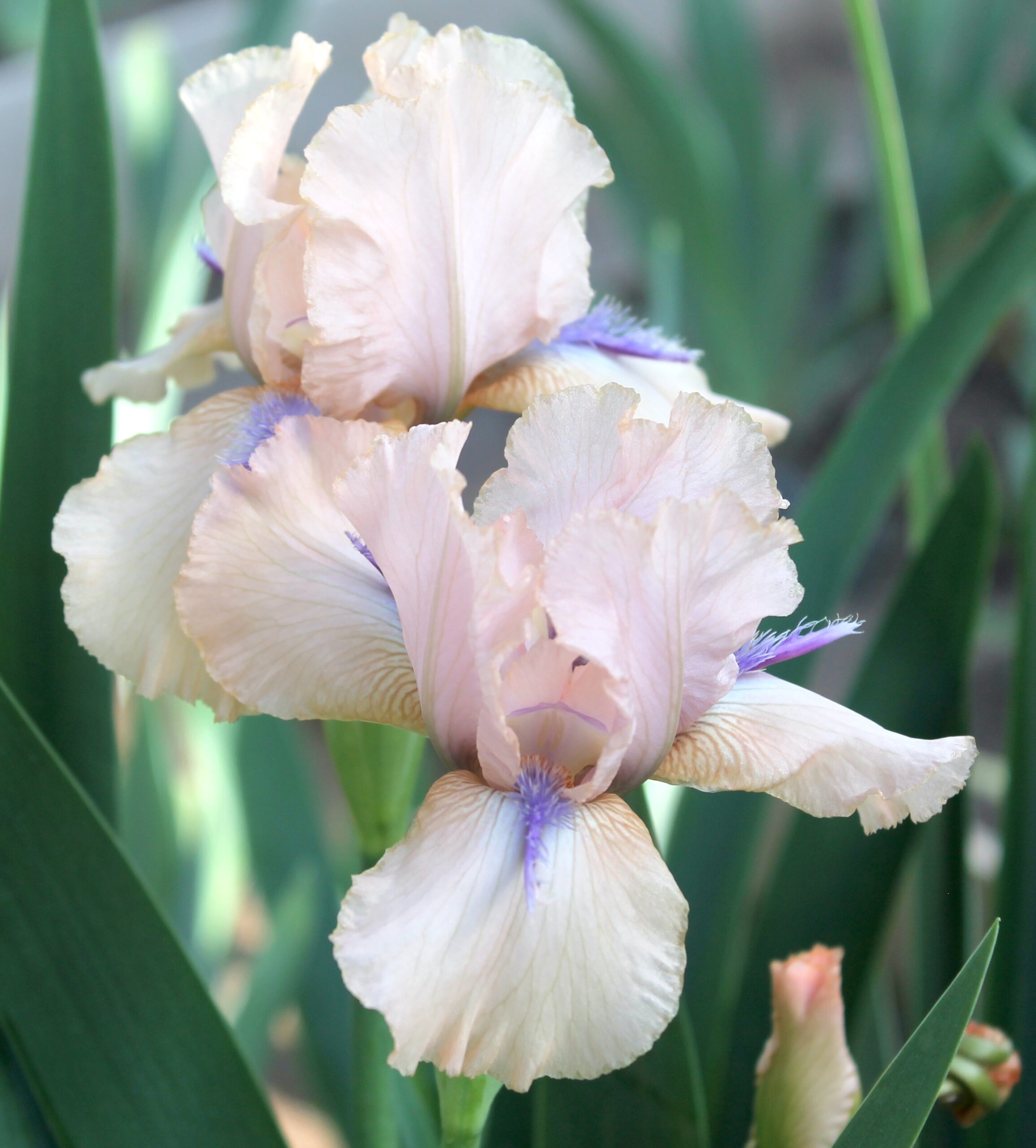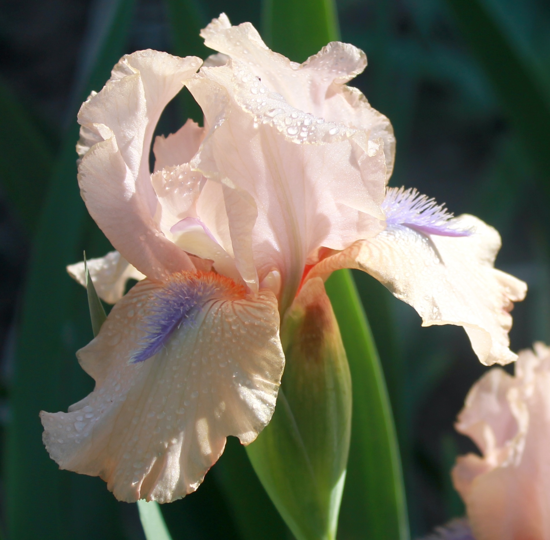 Iris intermedio barbudo de color único rosa amaranto con volantes y bronceado dorado con barbas anaranjadas y cuerno azul violeta oscuro.