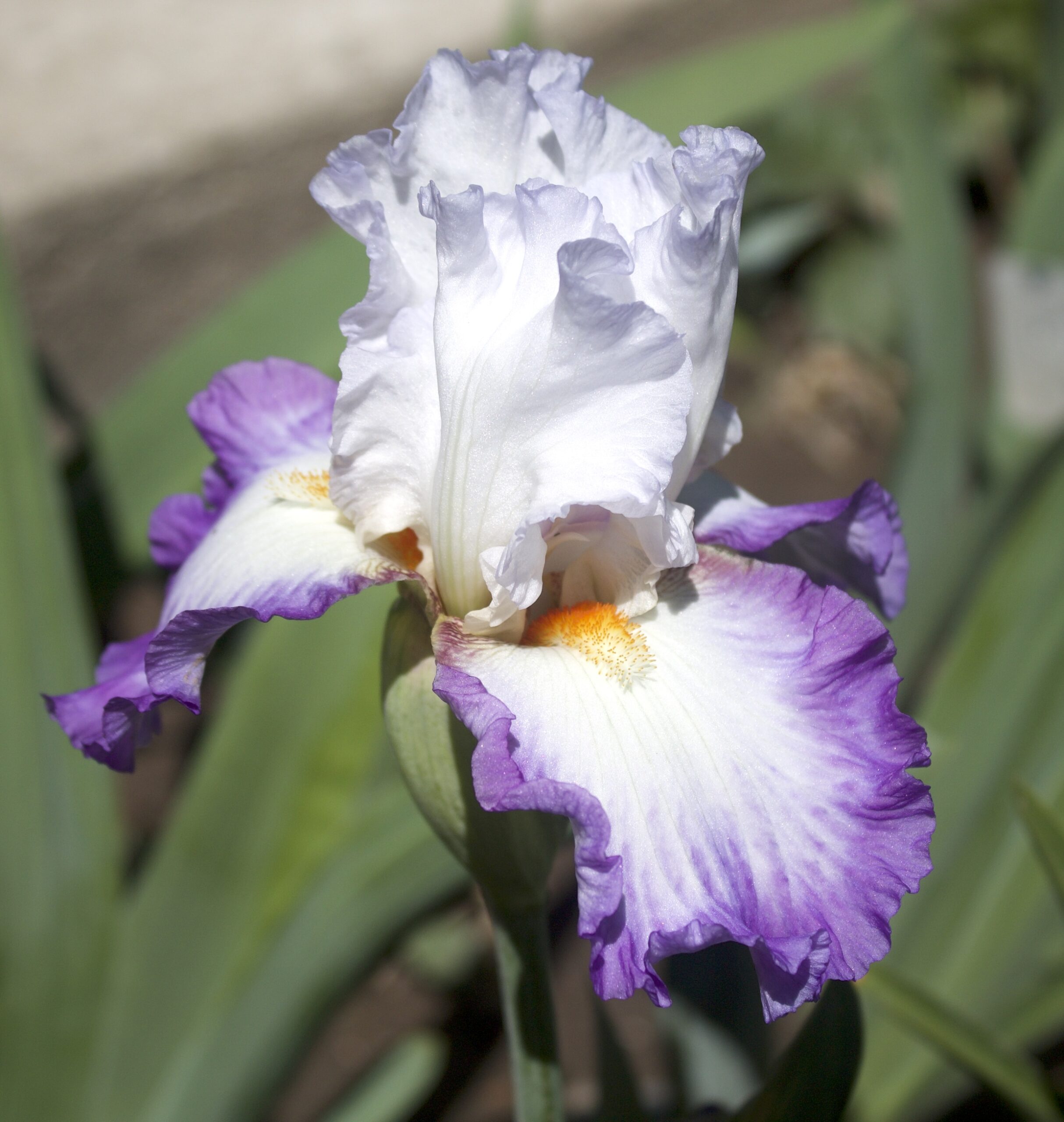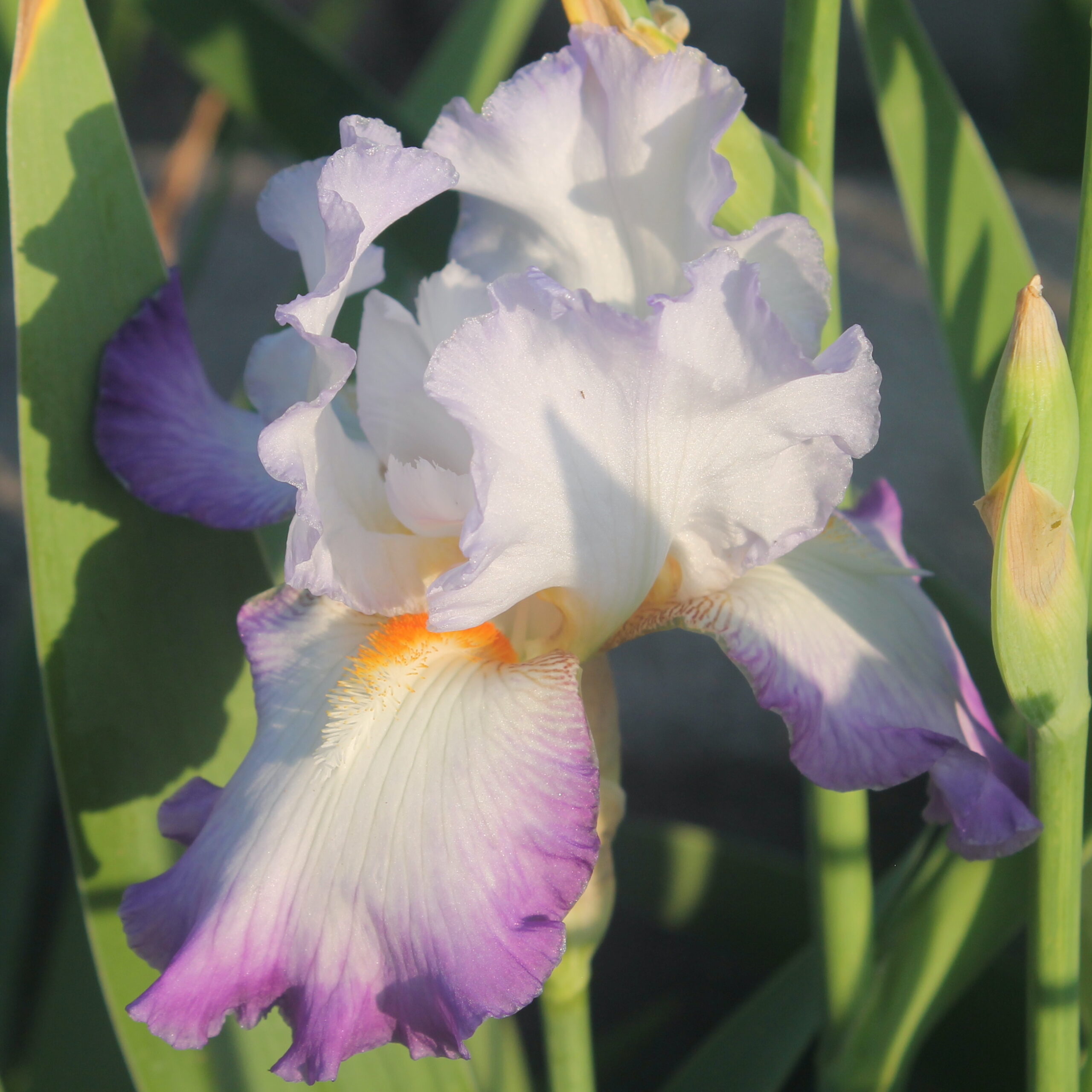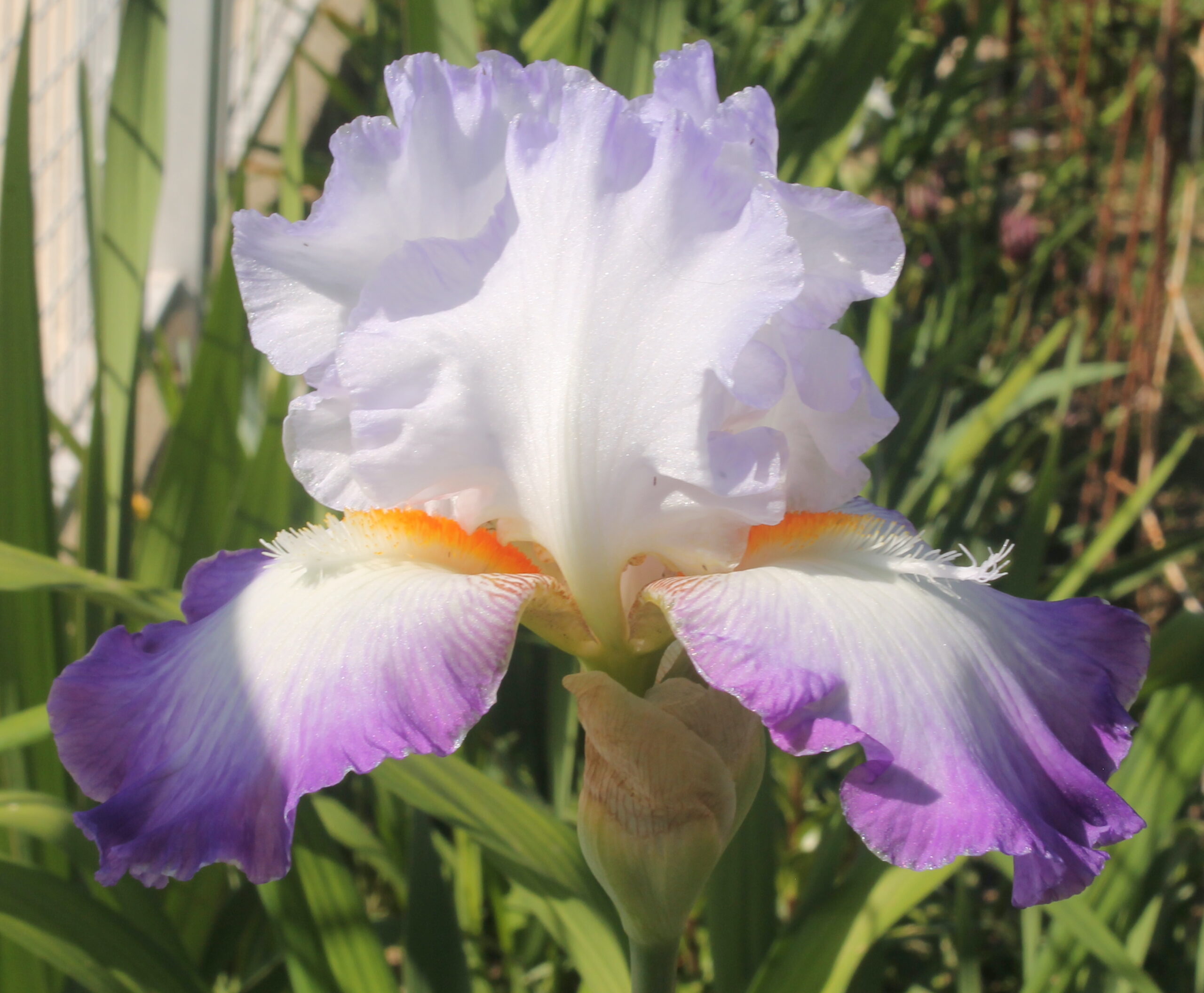 Iris alto barbudo con volantes de pétalos blancos de bordes infundidos de azul violeta pálido, sépalos blancos con borde que se difumina hasta violeta amatista intenso y brillante, barba blanca con punta mandarina y cuernos blancos.