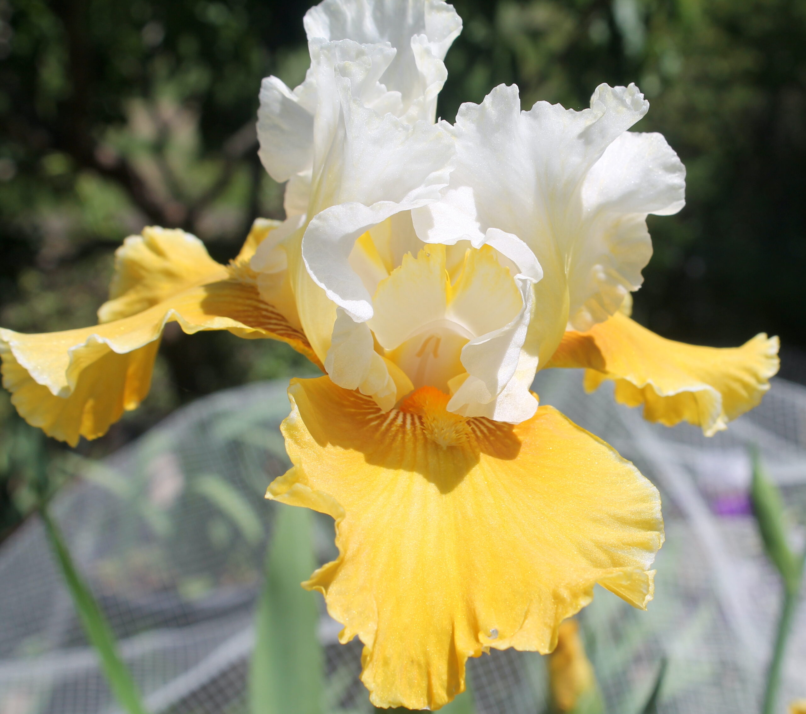 Iris barbudo alto con pétalos de color blanco puro y estilizados con linea central color miel y sépalos de color miel cobrizo, barba de color amarillo.
