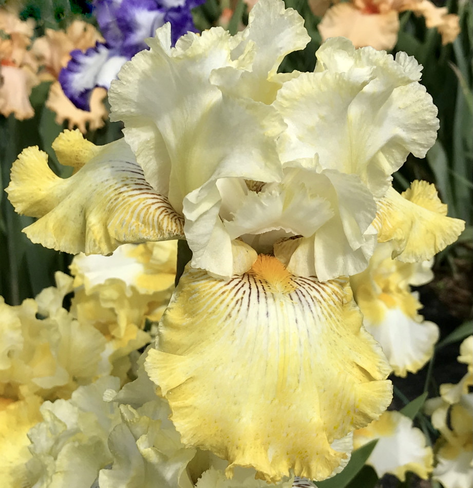 Iris alto barbudo de pétalos blancos con toque amarillos en la nervadura central y sépalos de fondo blanco, borde dorado, banda blanca estrecha, banda amarilla ancha y lineas precisas marrón violáceo cerca de las barbas color naranja mandarina.