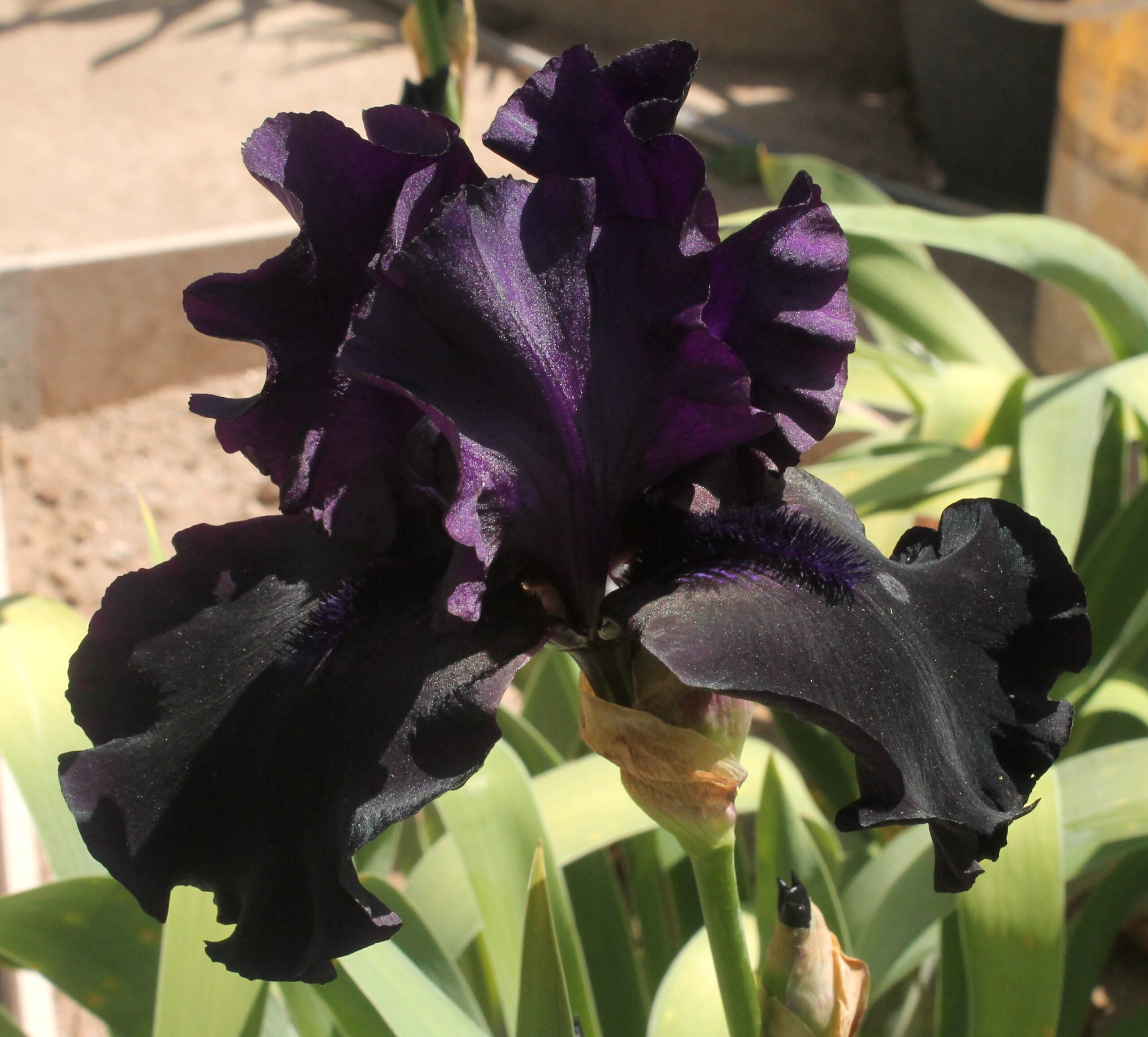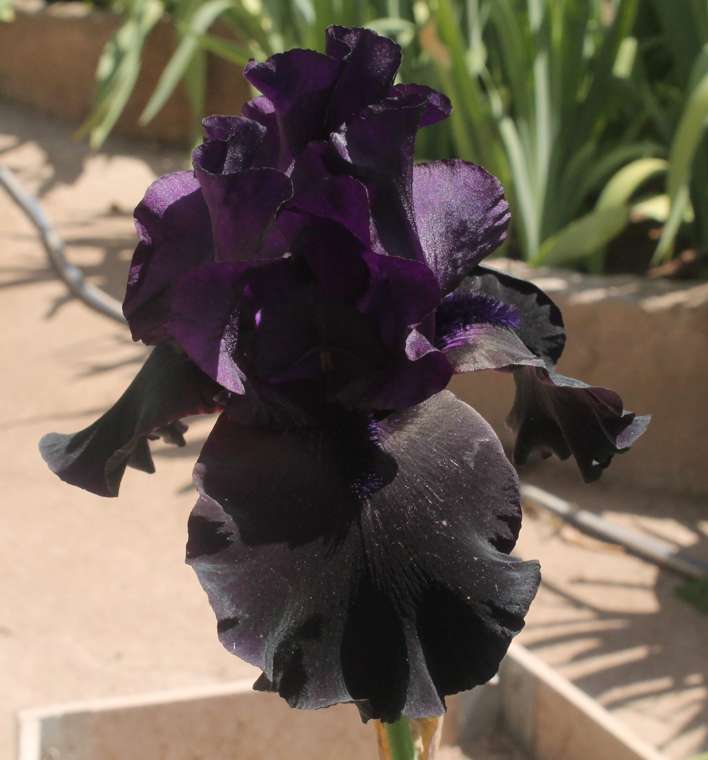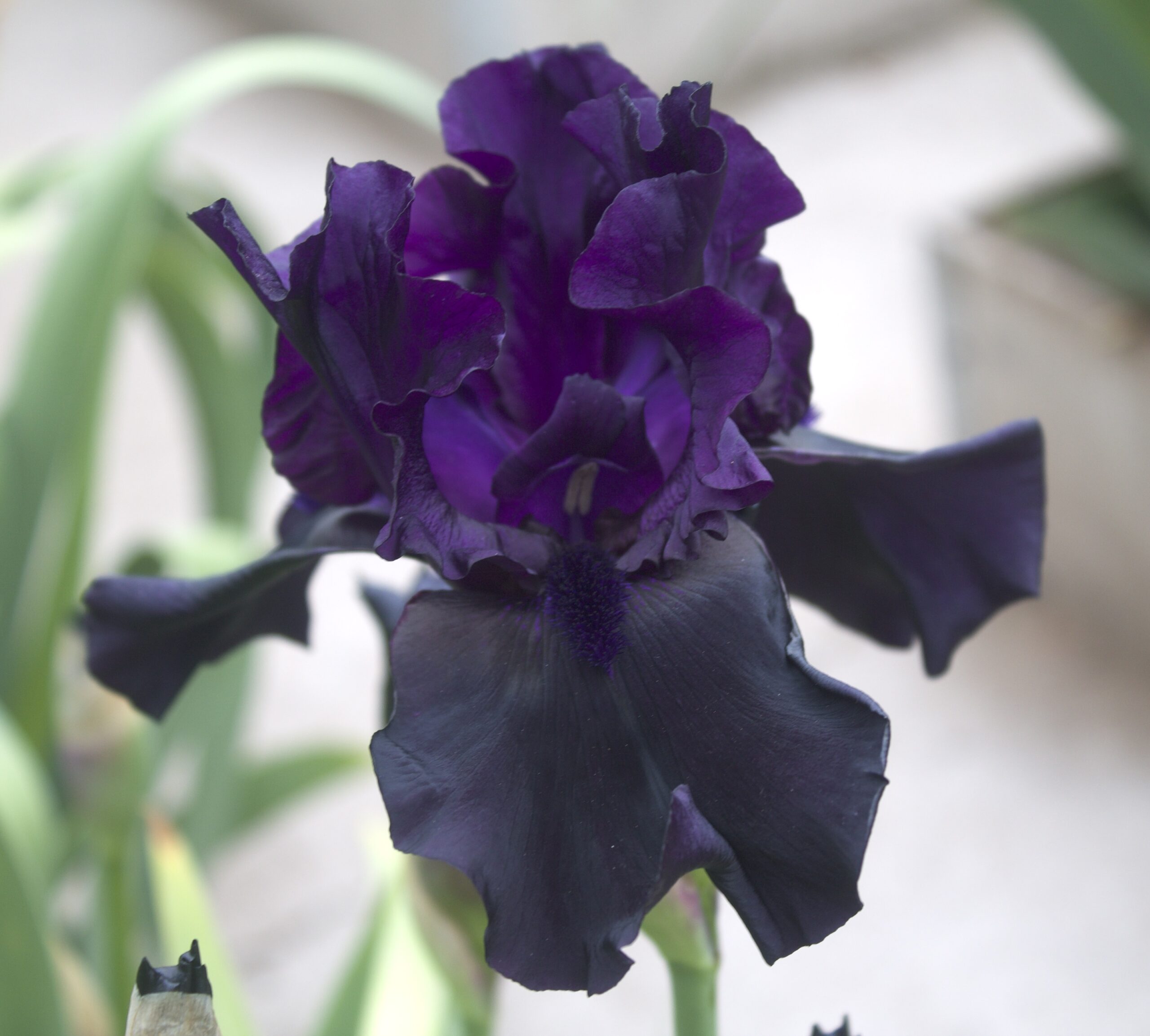 Iris alto barbudo con pétalos de color violeta oscuro y sépalos casi negros con barbas violetas negras.
