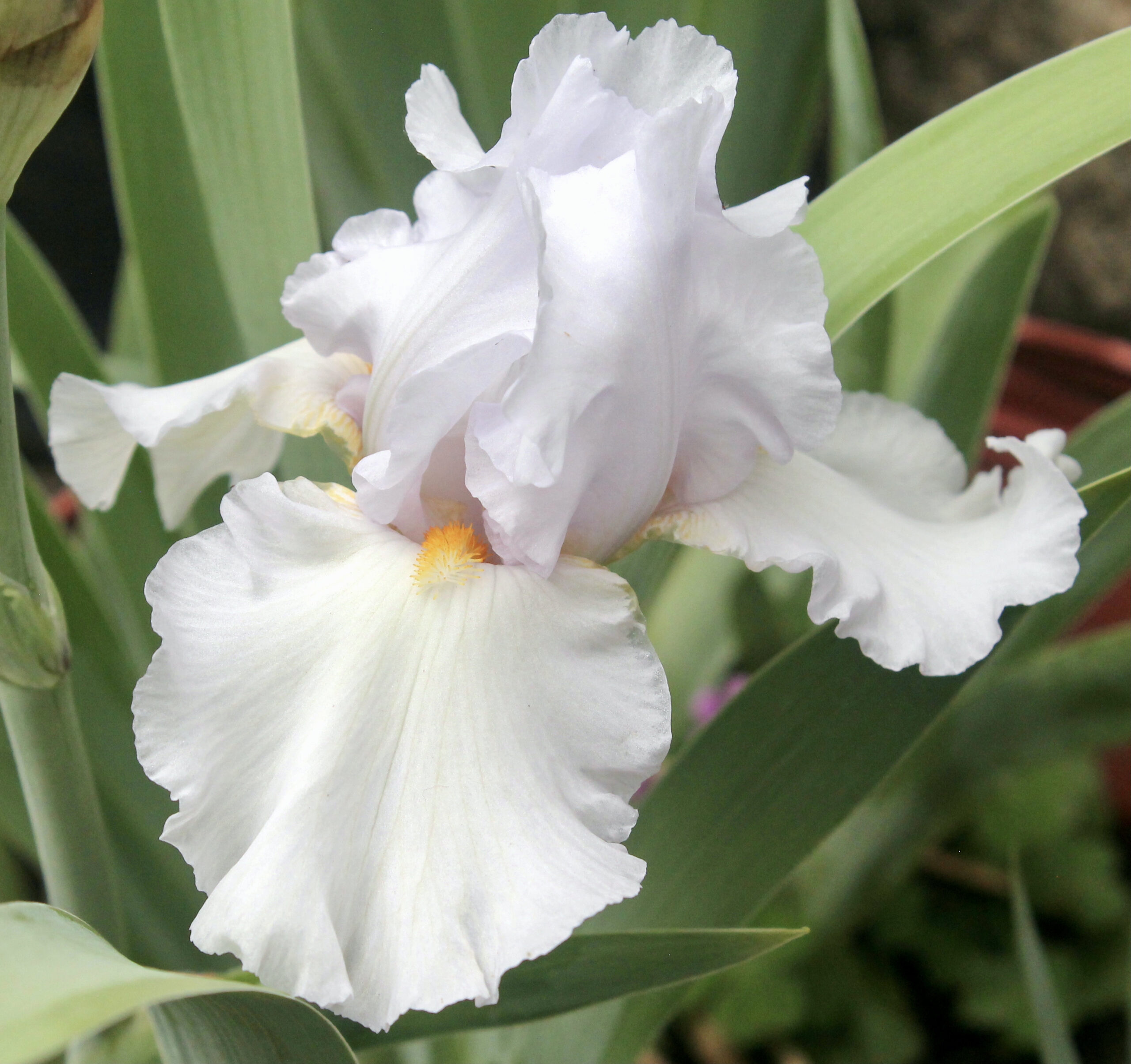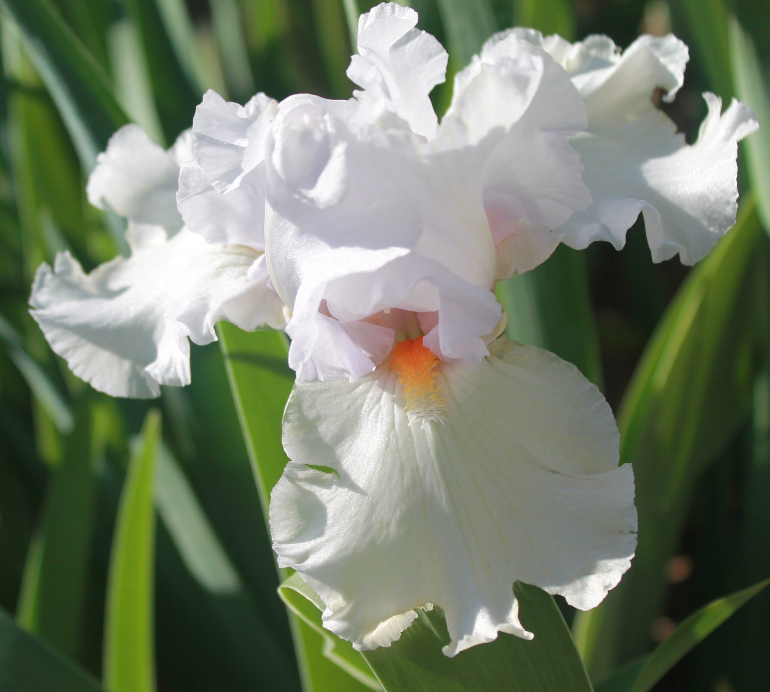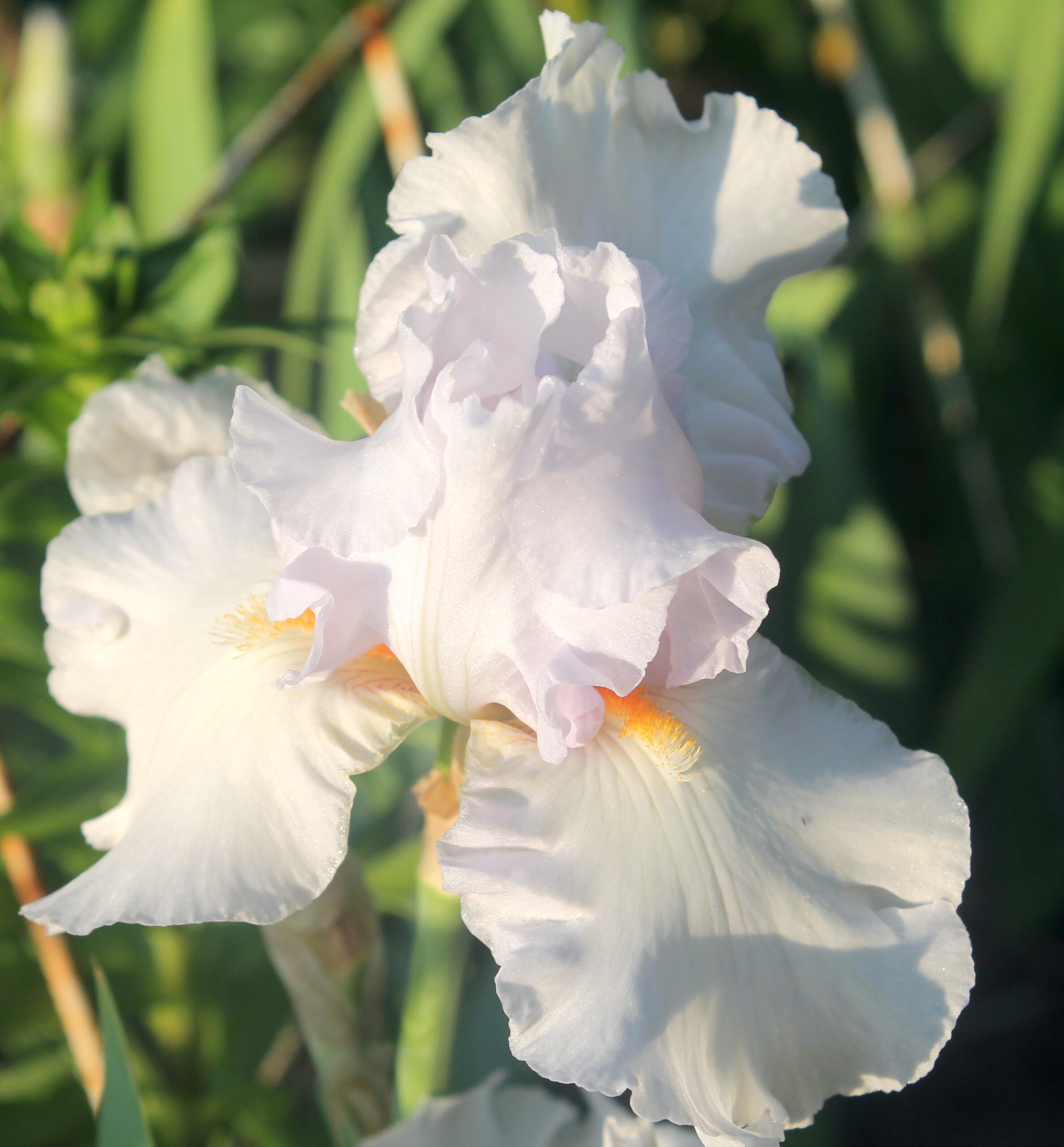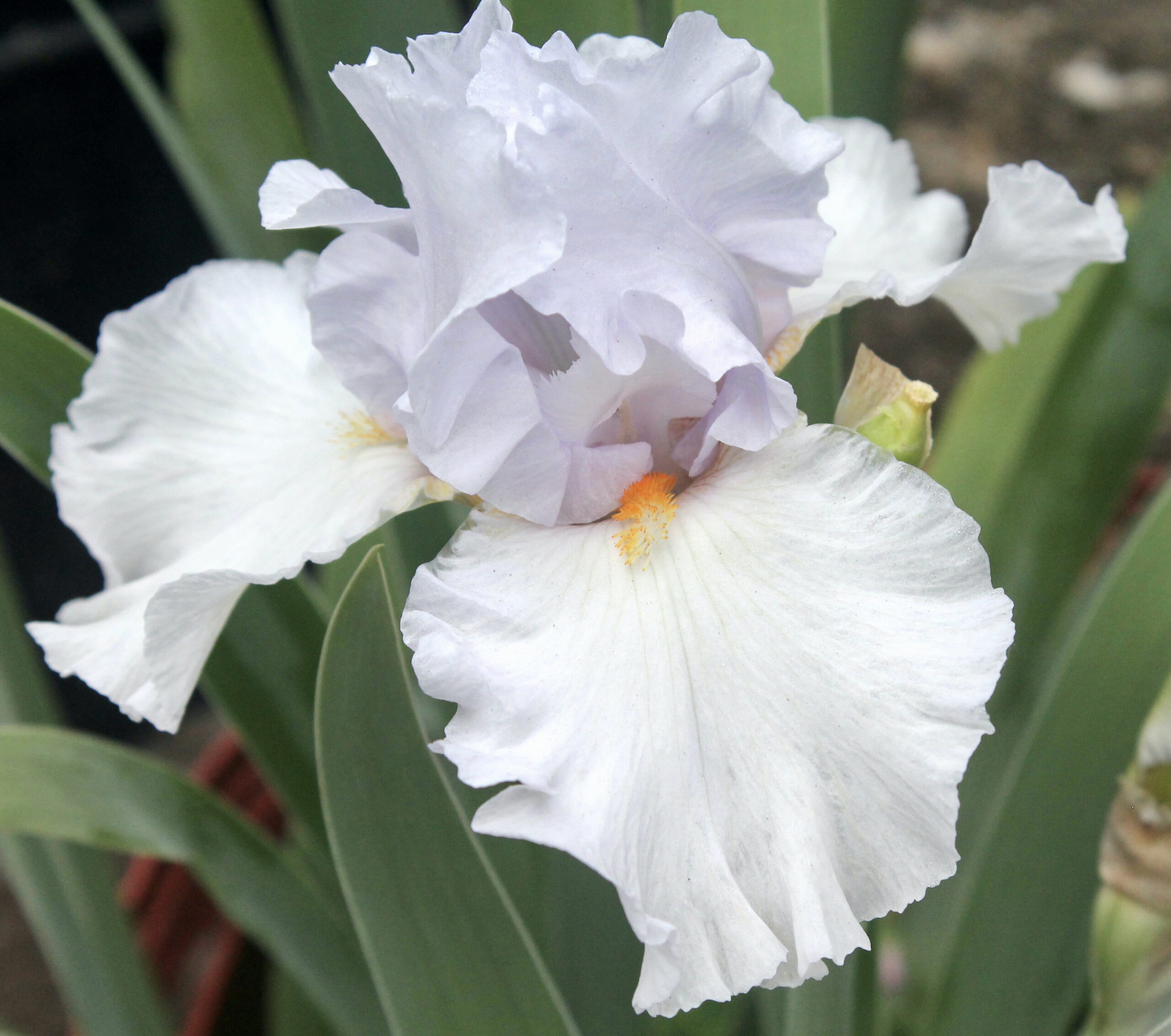 Iris alto barbudo bitono rizado con pétalos color violeta muy pálido y sépalos violetas casi blancos con barba mandarina erizada.